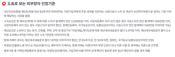 - 국민건강보험법 시행규칙 제2조 별표1에 따른 부양요건과 별표1의 2에 따른 소득 및 재산요건을 모두 충조해야 함