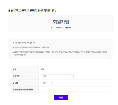 국군복지포털에서는 면세주류 할당관리를 위해 현역군인(간부, 현역병) 및 군무원 정보를 보유하고 있습니다. 따라서 현역군인 및 군무원 분들은 회원가입 시 본인의 군구분, 신분구분, 군번을 정확히 입력해주셔야 하며, 부정확하게 입력 시 자동가입 절차가 수행되지 않을 수 있으니 유의하시기 바랍니다.