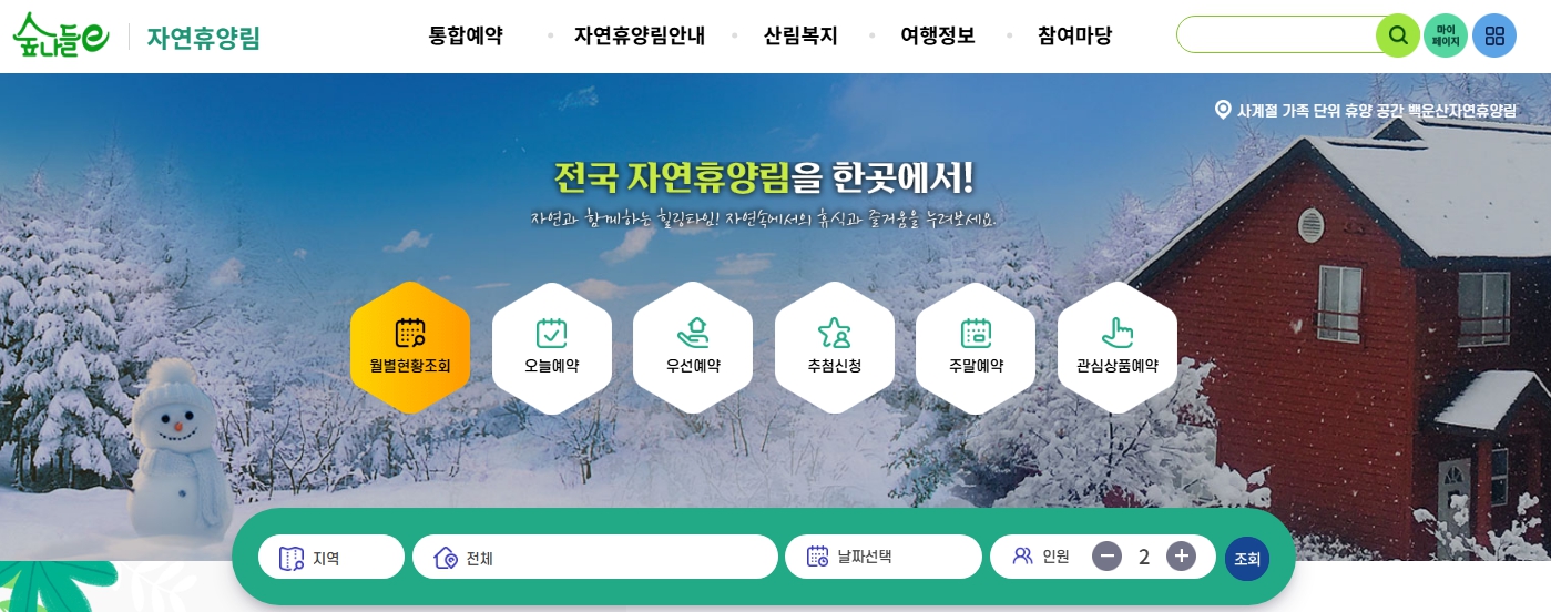 - 지역: 경기도, 강원도 등 특정 지역의 휴양림을 검색할 수 있습니다.