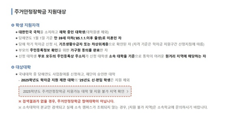 - 기초/차상위계층 기준 미충족: 소득 구간이 기초 또는 차상위계층을 벗어난 경우입니다. 일반적인 국가장학금 1~4구간 학생은 이 주거안정장학금의 지원 대상이 아닙니다.