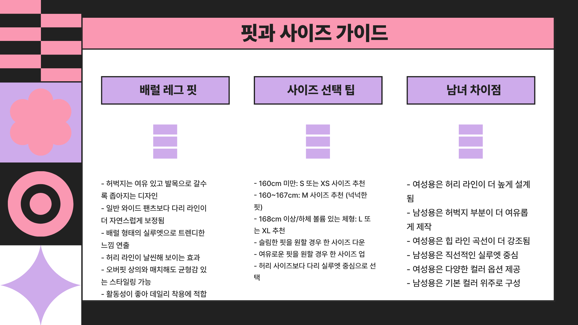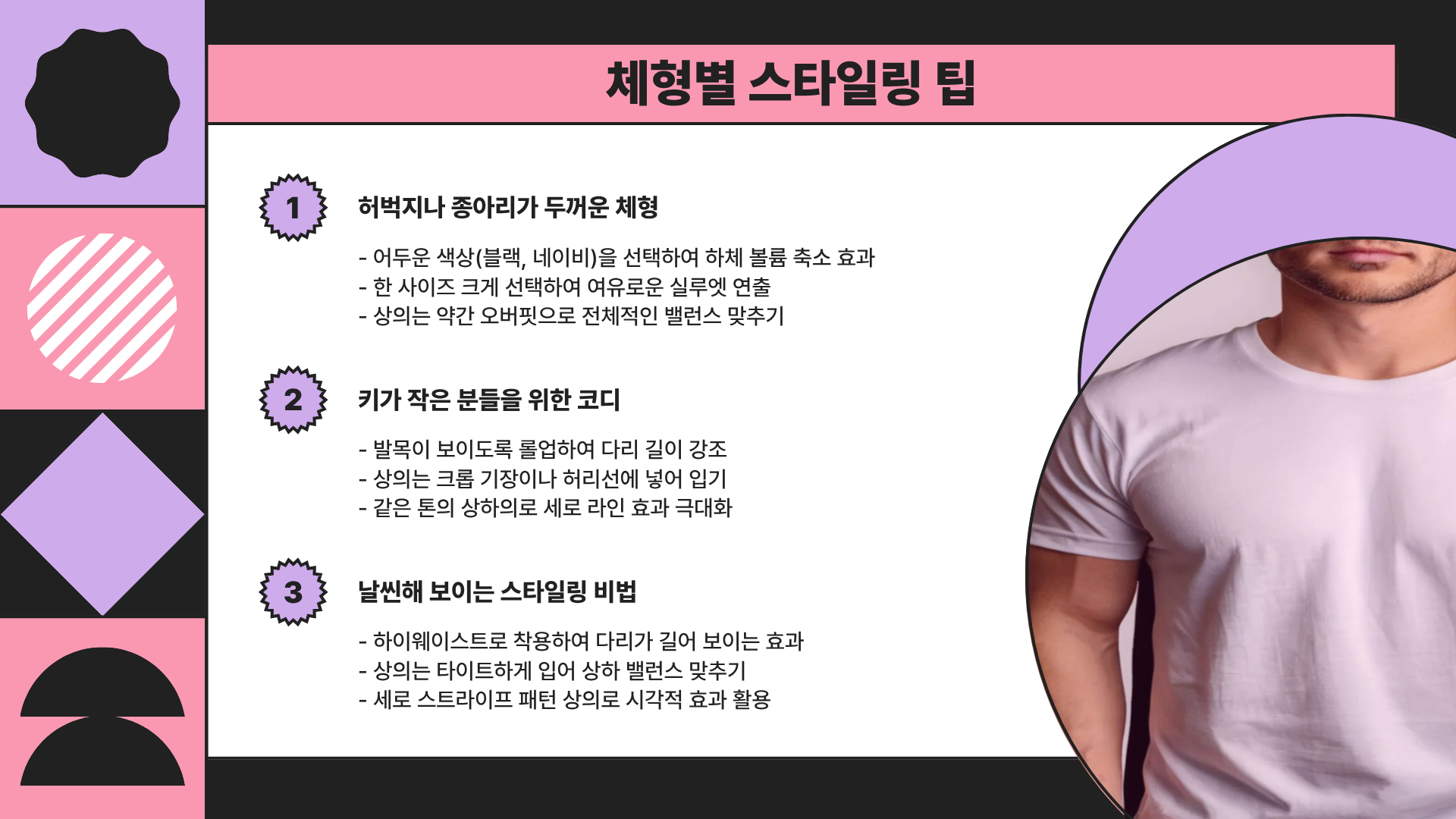 | 추천 스타일 | 미니멀, 트렌디 캐주얼, 원마일웨어 | 힙합, 레트로, 포멀 와이드 |