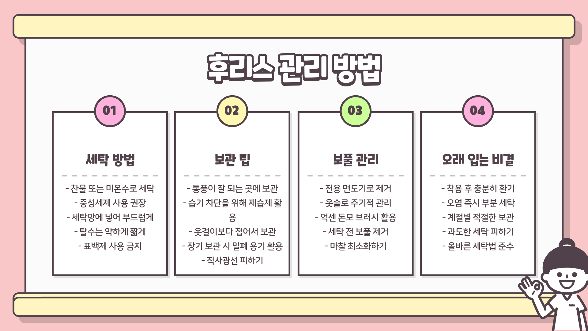 - 세탁망 사용 및 단독 세탁: 후리스의 털이 다른 옷과의 마찰로 손상되거나 뭉치는 것을 방지하기 위해 반드시 세탁망에 넣고 단독 세탁하는 것이 좋습니다. 세탁 시 코스는 '울 코스'나 '섬세 코스'를 선택합니다.