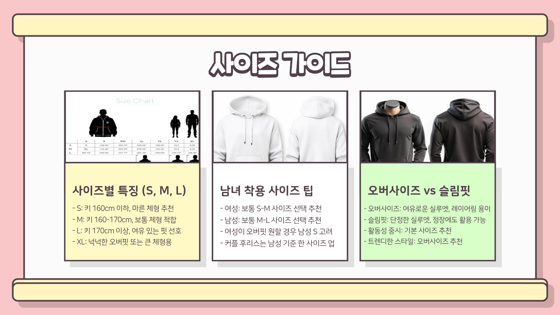 | 루즈하고 편안한 오버핏 (스트리트 감성) | 2 사이즈 이상 업 | 힙을 덮는 기장감으로 레깅스나 조거 팬츠와 매치하기 좋으며, 귀엽고 캐주얼한 느낌을 극대화합니다. |