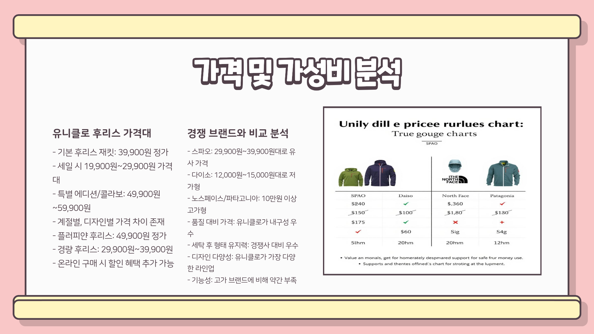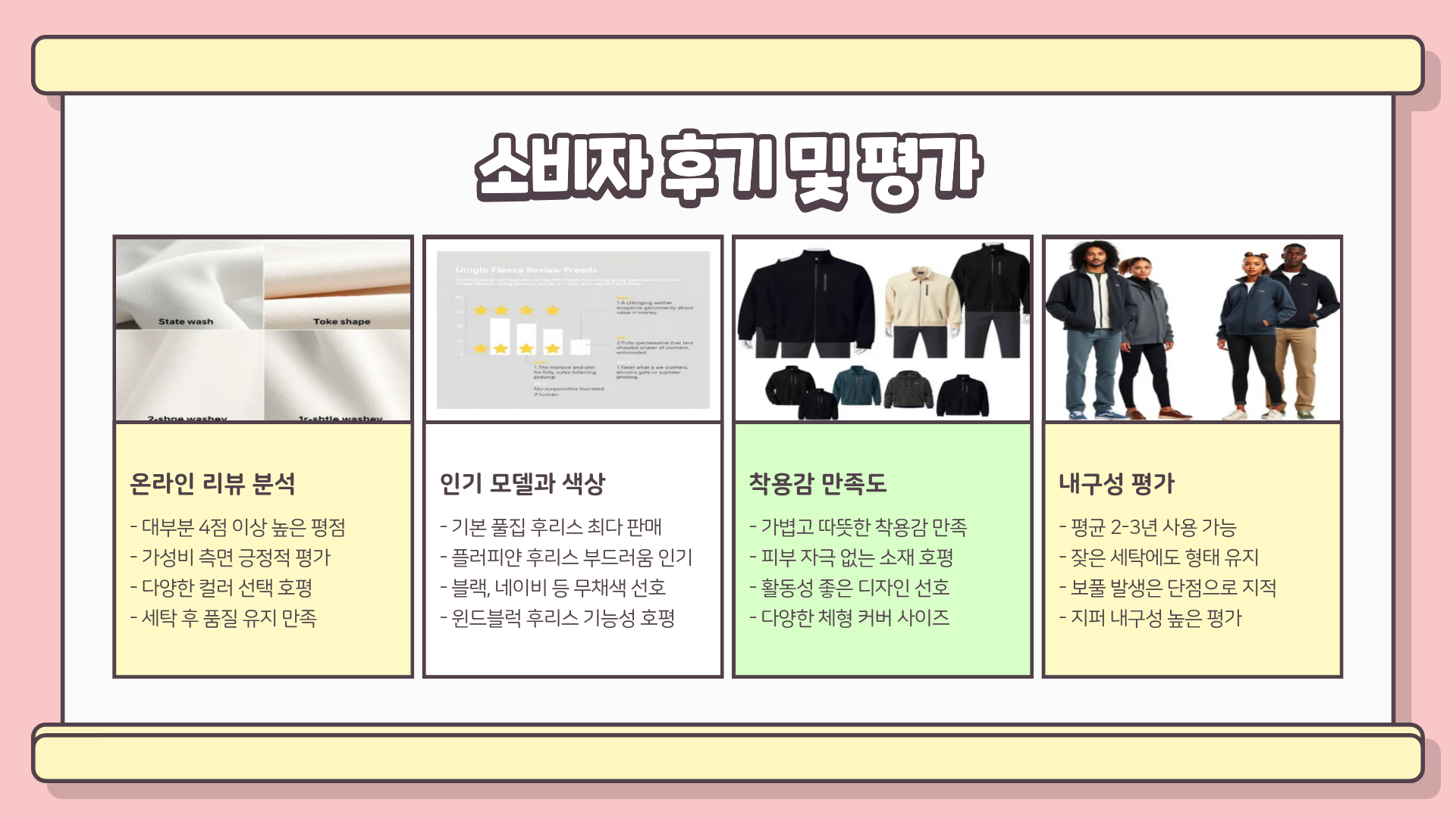 - 지속적인 디자인 혁신: 초창기 기본 디자인에서 벗어나, 매년 트렌드를 반영한 다양한 핏(오버사이즈, 레귤러)과 패턴, 그리고 소재를 결합한 새로운 모델(보아 후리스, 웜 후리스 등)을 출시하여 소비자들의 선택 폭을 넓히고 있습니다.