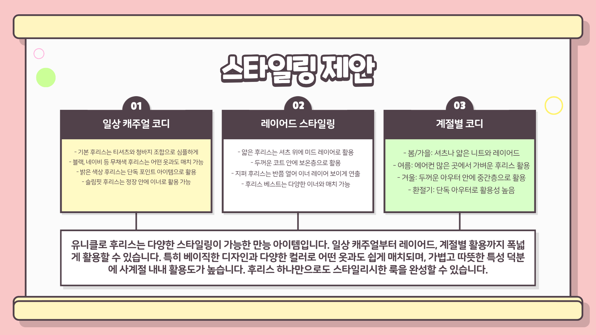 - 이너와의 레이어드: 후리스 안에 얇은 터틀넥이나 셔츠를 받쳐 입으면 보온성도 높이고, 단정한 느낌을 더할 수 있습니다. 셔츠의 칼라나 터틀넥의 넥 라인이 살짝 보이게 연출하면 심심하지 않은 코디가 완성됩니다.