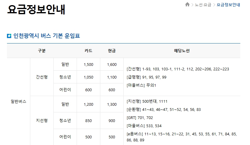 - 간선.지선버스 : (환승할 경우) 10Km내 기본, 10~40Km(5Km마다 100원 추가), 40Km 초과(100원)