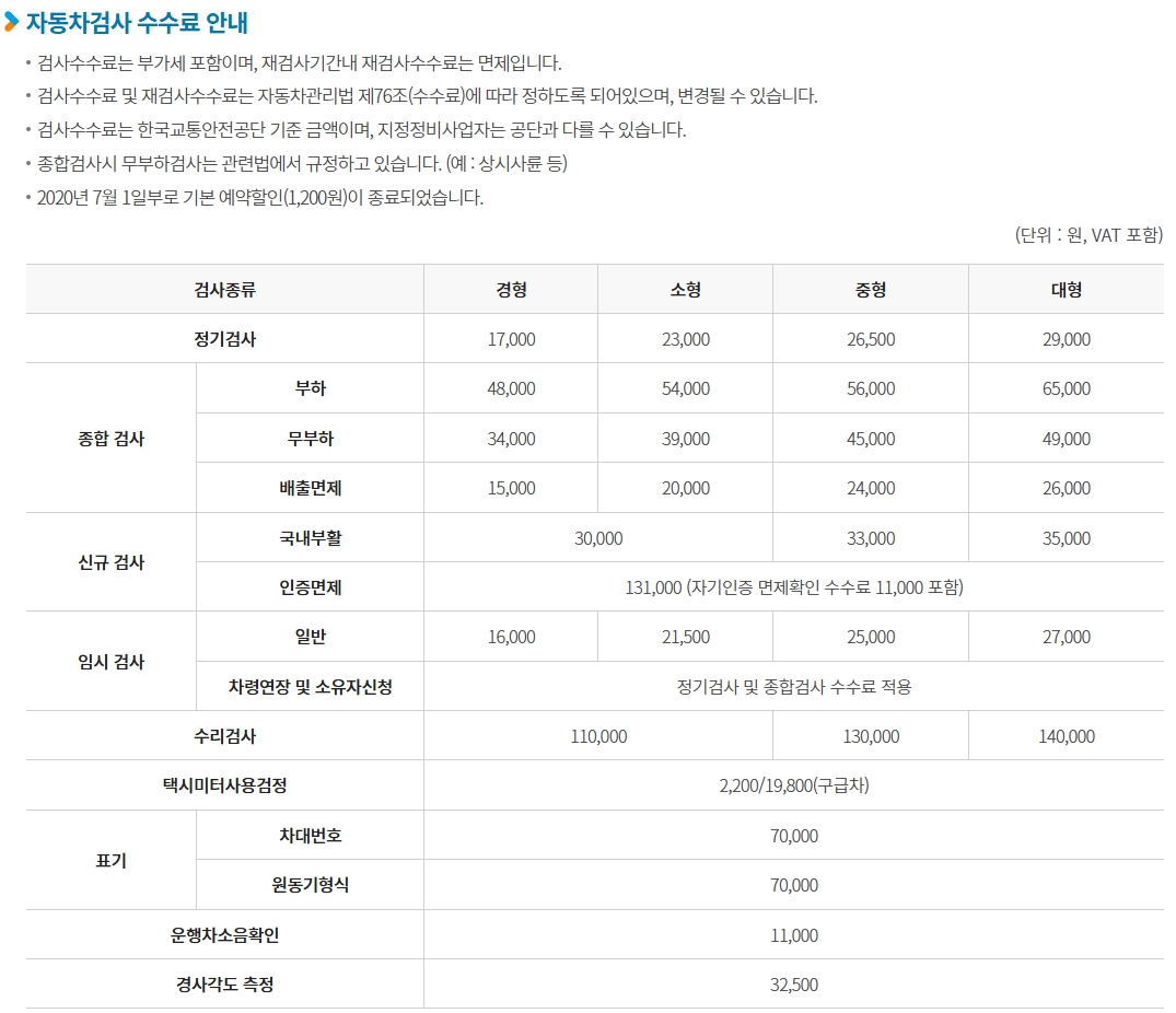 - 비용 (한국교통안전공단 기준): 경형 17,000원, 소형/중형/대형 23,000원/26,500원/29,000원