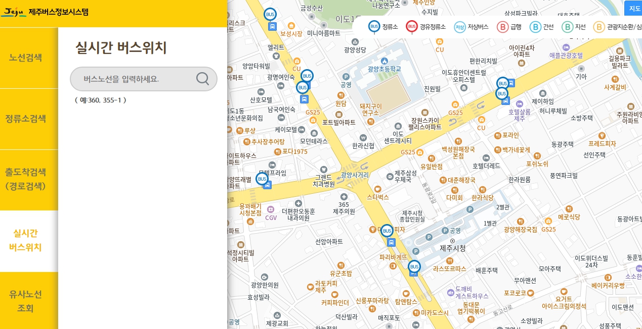 - 실시간검색 : 노선번호를 통해 운행 중인 버스의 실시간 위치 및 도착 예정정보를 확인할 수 있습니다.