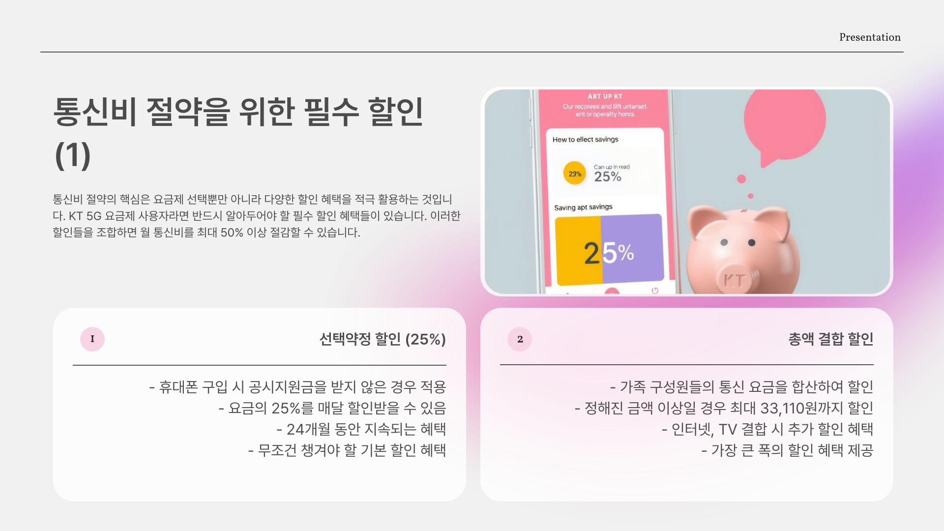 오늘 제가 정리해 드린 KT 5G 요금제 정보가 현명한 통신 생활에 큰 도움이 되었기를 바랍니다. 가장 중요한 것은 '나의 데이터 사용량'을 정확히 파악하고, 놓치고 있던 '가족 결합 및 선택약정' 할인을 반드시 적용하는 것입니다. 불필요하게 낭비되던 통신비를 아껴서, 여러분의 지갑을 두둑하게 채우시길 응원합니다.