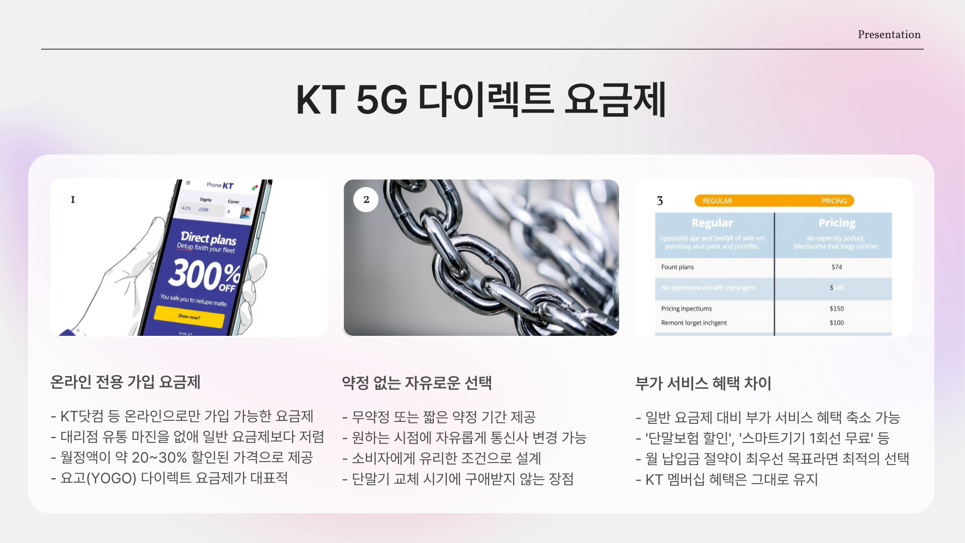 - 직영 온라인 채널 할인 (KT닷컴): KT닷컴에서 요금제를 가입하면 추가로 7%의 요금 할인을 제공하는 프로모션이 진행되기도 합니다. 다이렉트 요금제와 시너지를 낼 수 있습니다.
