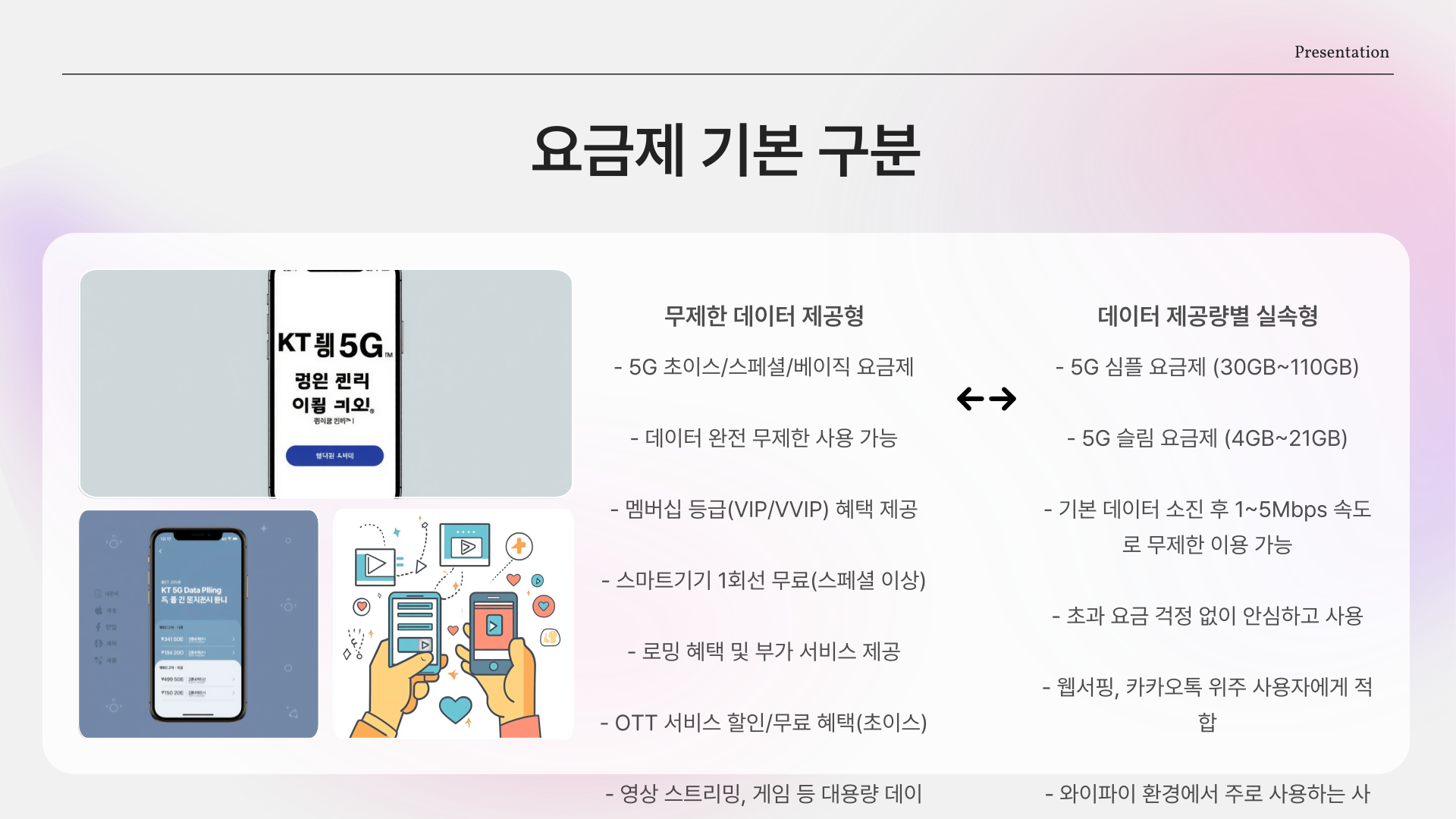 검색자가 더 이상 고민할 필요 없도록, 개인의 사용량과 라이프스타일에 따른 맞춤형 KT 5G 요금제 추천을 제시합니다.