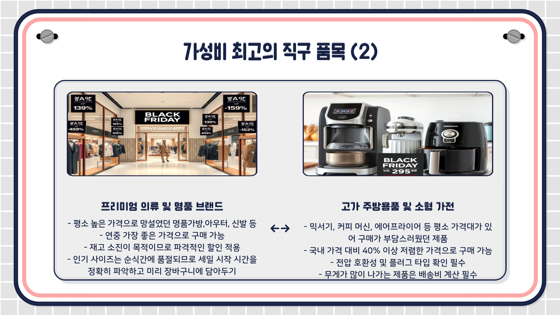 - 경험담: 저는 3년 전 블랙프라이데이에 국내 가격 대비 40% 이상 저렴한 가격으로 주방 가전을 구매해 지금까지도 만족하며 사용하고 있습니다.