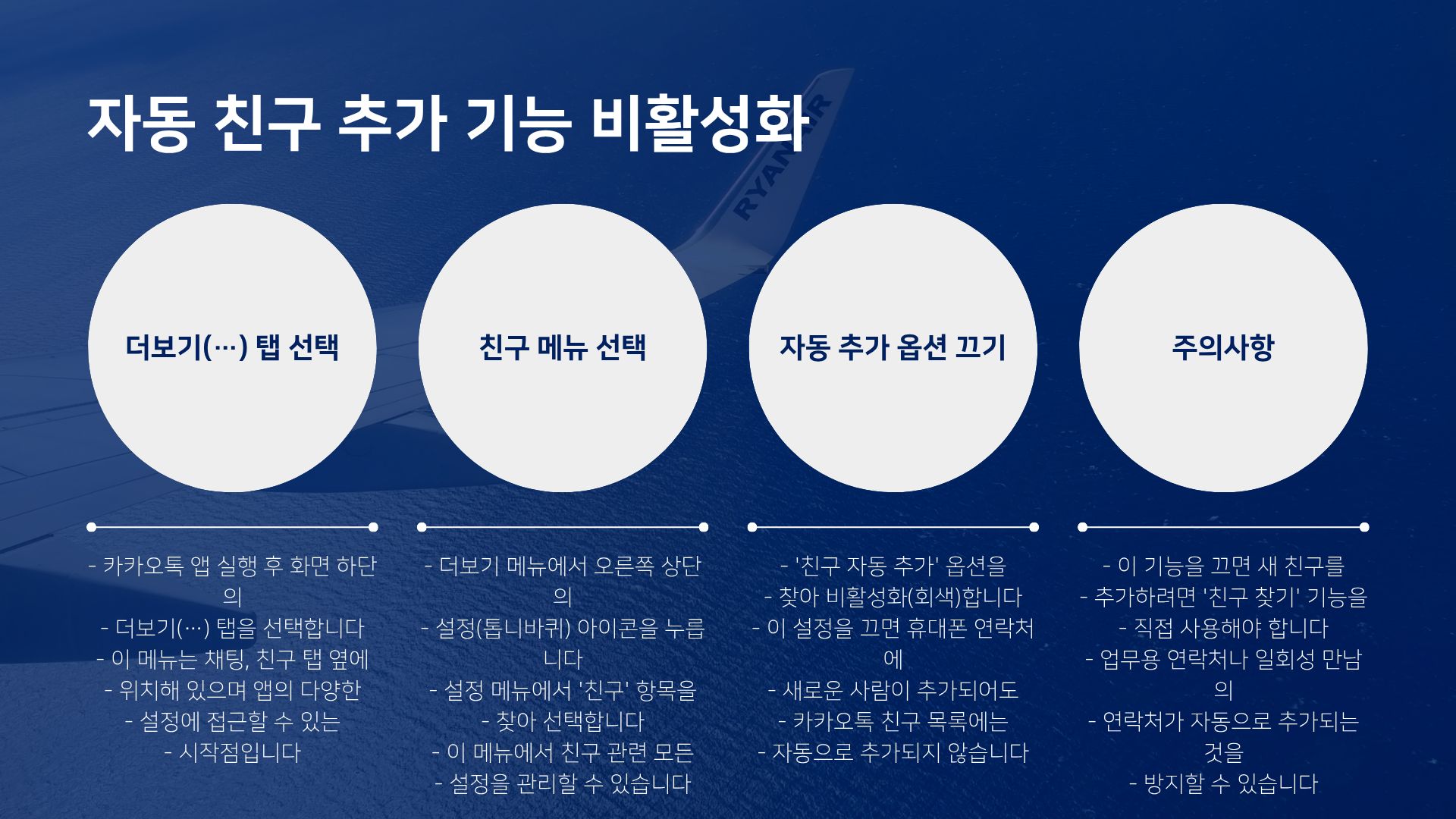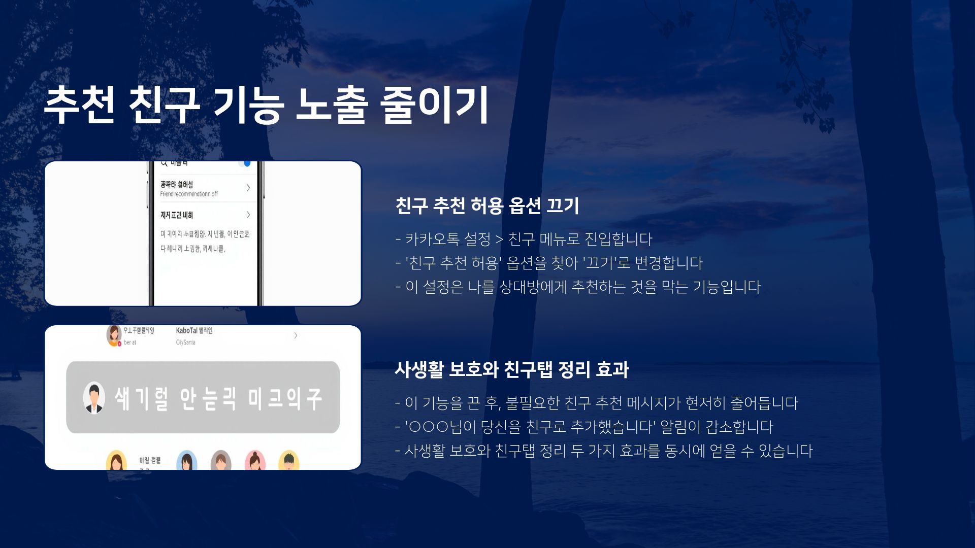 - 작성자 경험 공유: 이 기능을 끈 후, 저에게 오는 불필요한 친구 추천 메시지(ex. 'XXX님이 당신을 친구로 추가했습니다.')가 현저히 줄어들었습니다. 사생활 보호와 친구탭 정리 두 마리 토끼를 잡을 수 있습니다.
