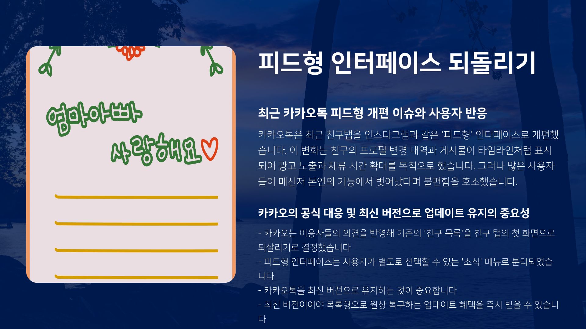 - 해결책: 카카오 측은 이용자들의 의견을 반영해 기존의 '친구 목록'을 친구 탭의 첫 화면으로 되살리고, 피드형 인터페이스는 사용자가 별도로 선택할 수 있는 '소식' 메뉴로 분리하는 개선안을 발표했습니다.