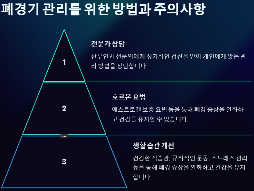 폐경은 여성의 삶에서 자연스러운 과정이지만, 다양한 증상을 동반하여 일상생활에 불편함을 초래할 수 있습니다. 하지만 적절한 대처 방법을 통해 이러한 증상들을 완화하고 건강한 삶을 유지할 수 있습니다.