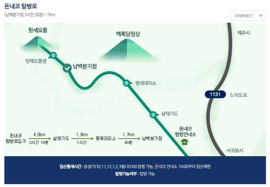 답변1. 동절기(10,11,12,1,2,3월) 05:00 탐방 가능, ->영실탐방로 입구 12:00부터 입산제한, 윗세오름안내소(남벽통제) 13:00부터 돈내코탐방제한/윗세오름안내소 15:00하산, 백록담(정상)은 성판악, 관음사 탐방로만 가능