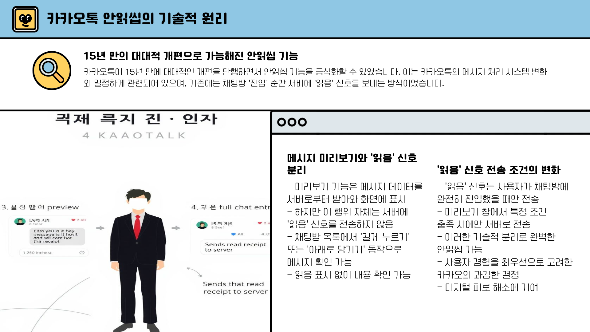 이러한 기술적 분리 덕분에 사용자는 내용을 미리 확인해도 숫자 '1'이 사라지지 않는, 완벽한 안읽씹이 가능해진 것입니다. 이는 사용자 경험을 최우선으로 고려한 카카오의 과감한 결정으로 평가받고 있습니다.