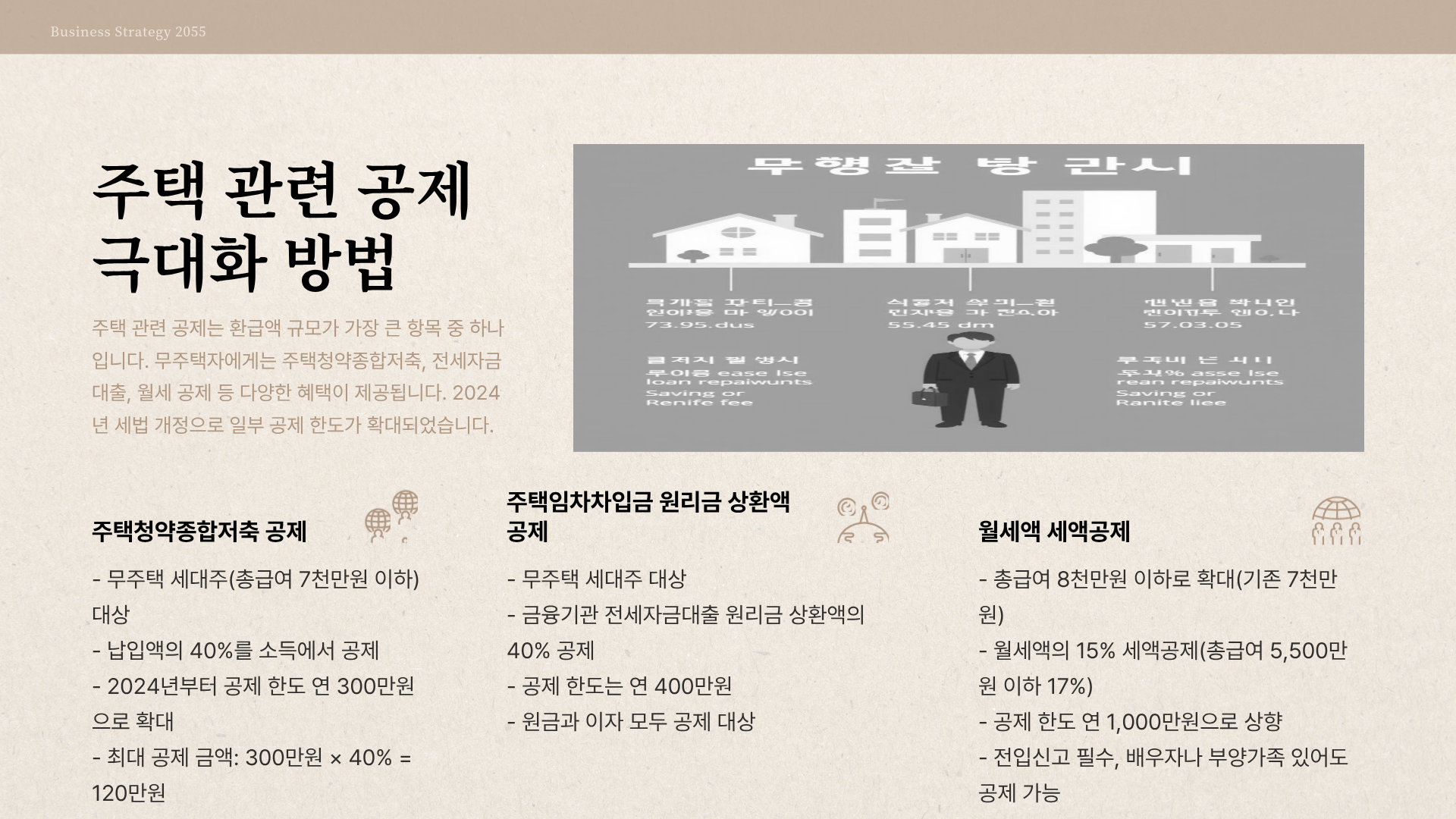 - 주의사항: 해당 과세기간에 주택을 소유했다면 공제받을 수 없습니다. 또한, 공제받기 위해서는 은행에 무주택 확인서를 제출해야 합니다.
