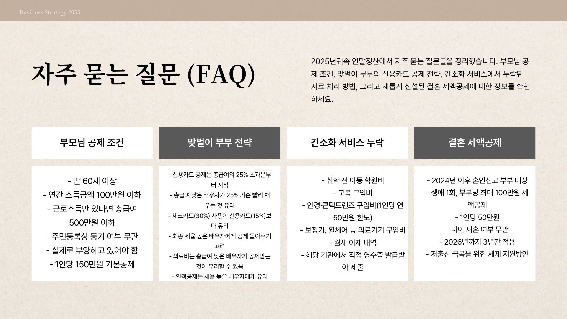 - Q1. 2025년귀속 연말정산 시, 부모님 공제 조건은 어떻게 되나요?