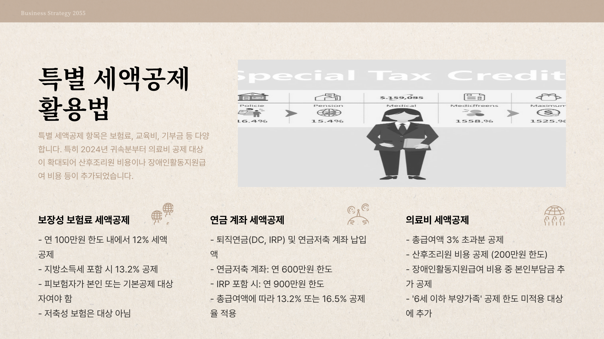 - 신용카드 사용금액 증가분 추가 공제 (한시적): 2023년 대비 2024년 신용카드 사용액이 5% 이상 증가한 경우, 증가분의 10%를 추가 공제 (최대 100만원 한도)