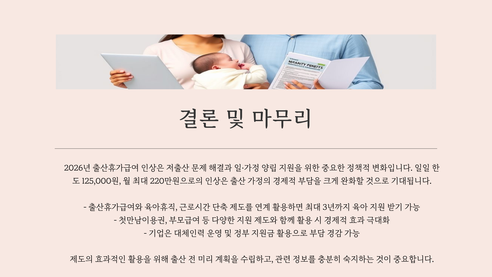지금까지 다룬 2026년 출산휴가급여 상한액 월 220만원 인상 내용을 한눈에 보기 쉽게 정리했습니다.