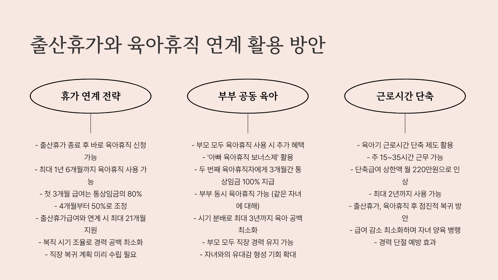 - 육아휴직과의 연계 활용: 여성 근로자가 출산휴가를 사용한 직후, 남성 근로자(배우자)가 육아휴직을 이어서 사용하면 공백 없는 돌봄이 가능합니다.