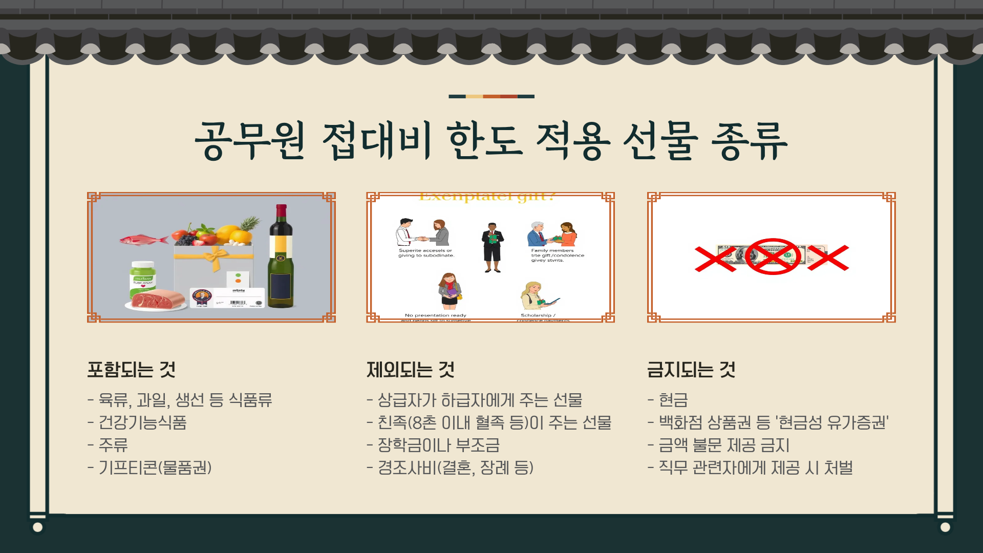 특히 주의할 점은 '기프티콘'입니다. 최근 법 개정으로 커피 쿠폰 같은 물품권은 5만 원 이내에서 가능해졌지만, 금액이 적힌 백화점 상품권은 여전히 엄격히 금지된다는 점을 기억하세요.
