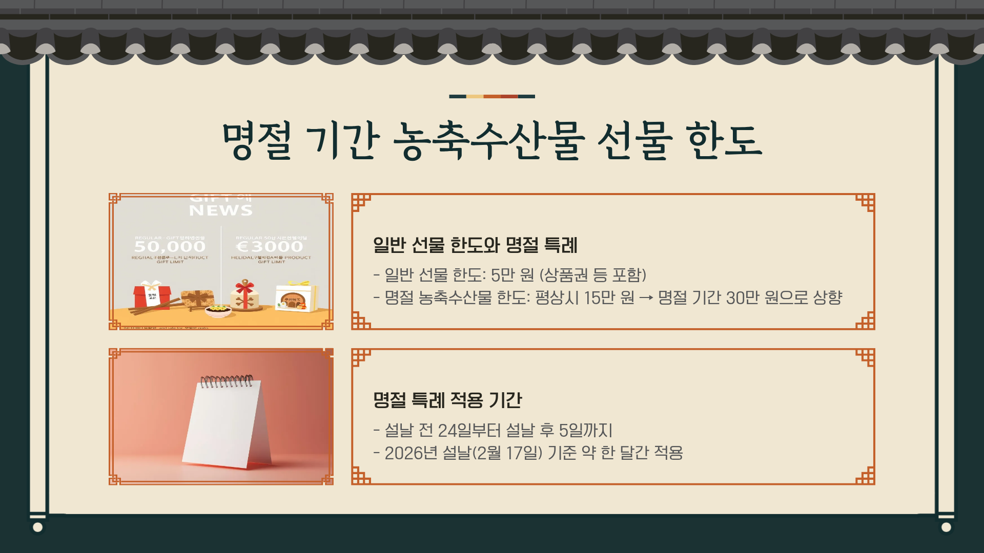 - 명절 농축수산물 한도: 평상시 15만 원 → 명절 기간 30만 원으로 상향