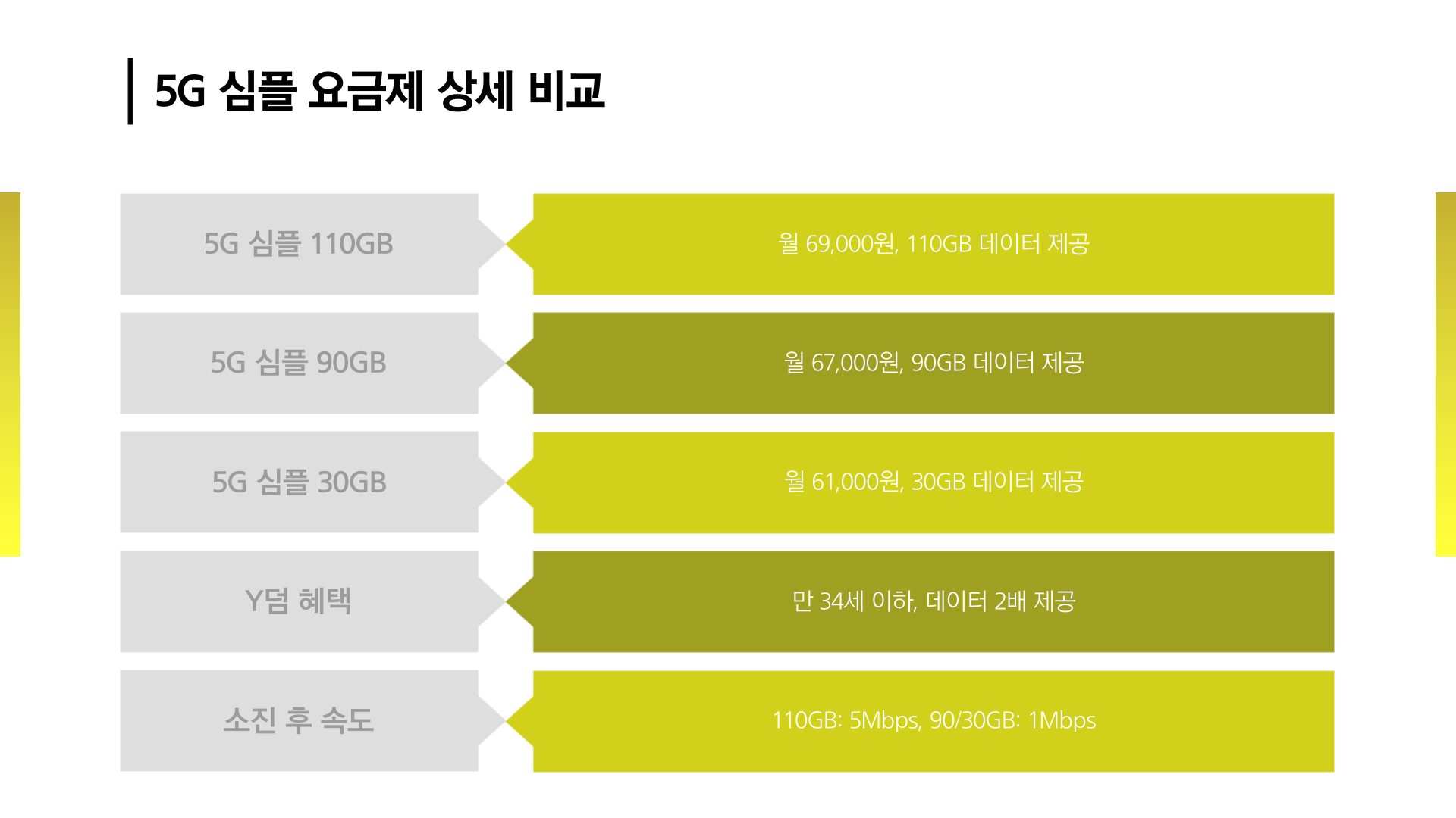 | 5G 심플 110GB | 69,000원 | 110GB | 최대 5Mbps |