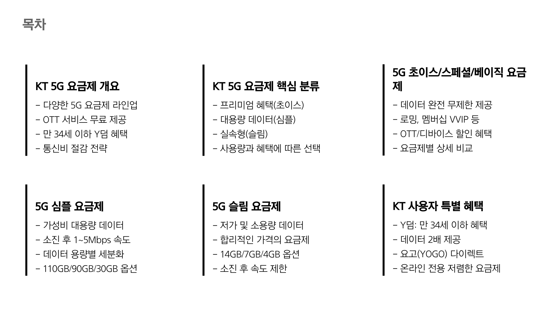KT는 SKT와 마찬가지로 다채로운 5G 요금제 라인업을 갖추고 있으며, 특히 OTT 서비스 무료 제공과 만 34세 이하 대상의 파격적인 Y덤 혜택으로 사용자 만족도가 높습니다.